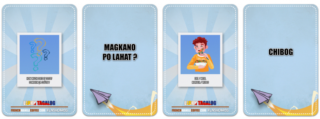 Voici des flashcards illustrées pour étudier du vocabulaire et des phrases en Tagalog, cette page sera mise à jour tout au long de l’année avec de nouvelles flashcards illustrées. Les flashcards sont composées sur le verso d’une image et du mot en français et anglais et sur le verso en tagalog.
