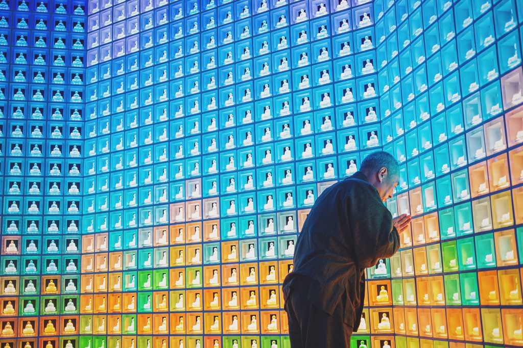 Le propriétaire du sento traditionnel «Atamiyu» à Kagurazaka, Tokyo. (2015)A monk of «Kōkoku-ji» temple (Shinjuku, Tokyo) prays in the room of the illuminated urns, where the bones of the deceased are kept. The urns change colors and adapt to the seasons. We find here the harmonious synthesis between tradition and the modern world. (2015)