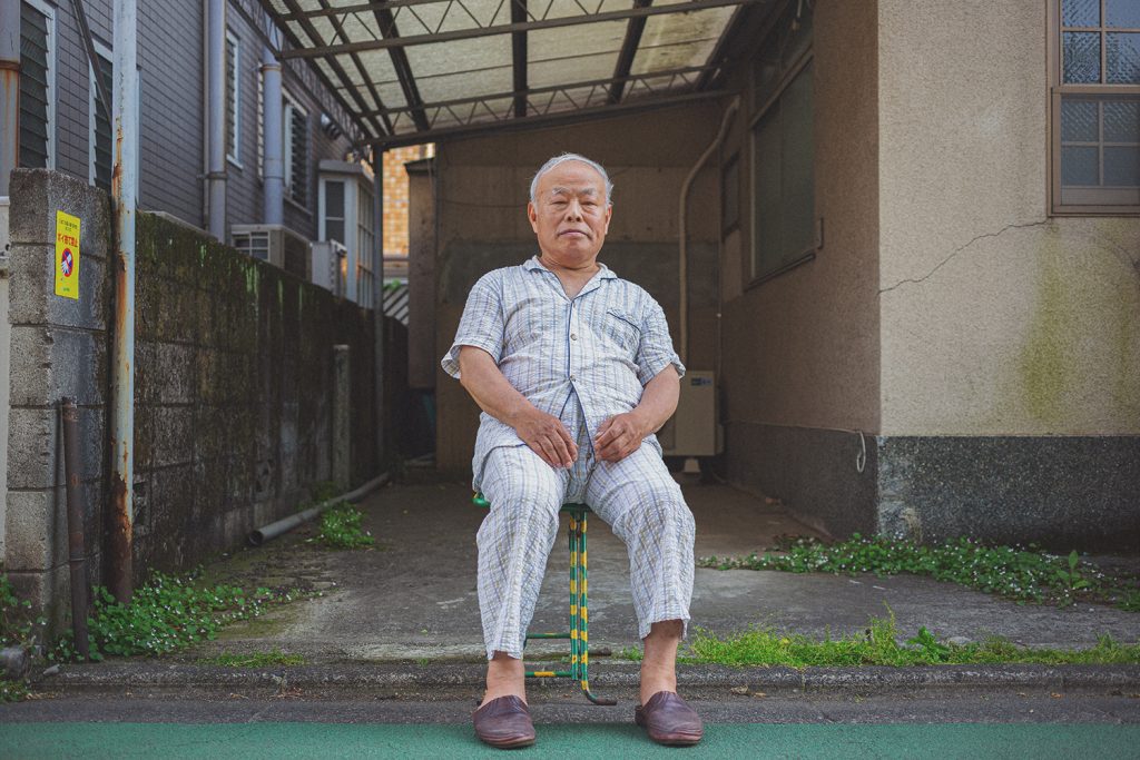 Routine matinale : Yoshiichi-san est assis tranquillement dans la rue devant chez lui, à Tokyo. (2015)Cigarette break. (2015)